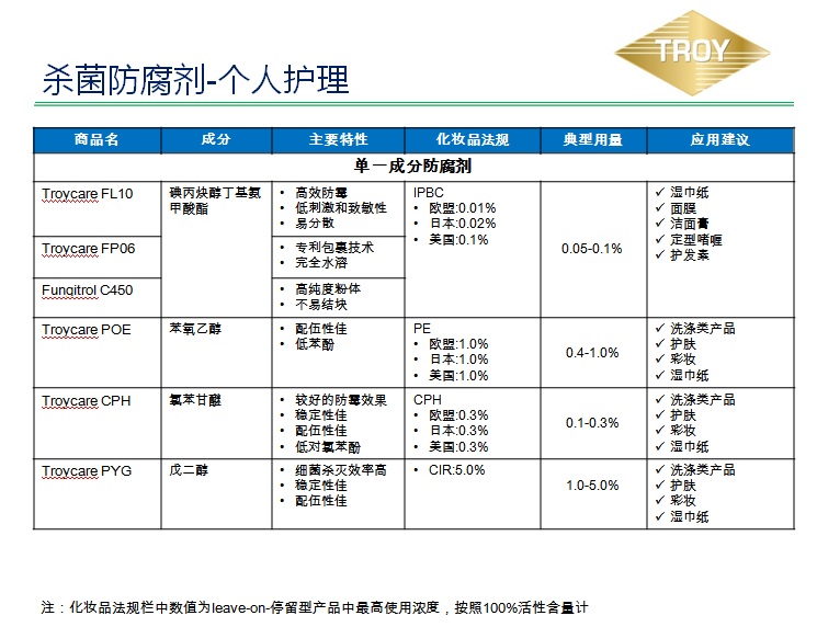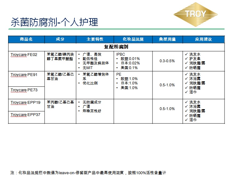 Troy 防腐劑事(shì)業(yè)部(Troy Corporation Preservatives)目前有(yǒu)200多(duō)種防腐劑産品正被使用(yòng)。如(rú)需查看(kàn)↓具體(tǐ)産品,歡迎緻電(diàn)國(guó)初科(kē)技(jì)索取最新資料: 0592-6518670,0592-6514970.