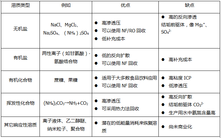 針對(duì)不(bù)同的(de)滲透壓,汲取液再生(shēng)過程可(kě)以輔以不(bù)同的(de)技(j‌ì)術(shù), 包括反滲透,膜蒸餾,電(diàn)滲析等等。