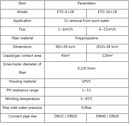 Specifications of ETO membrane contactor: