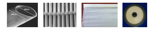 Hollow fiber → Knitted fiber (under microscope) → Knitted fi§ber (naked eyes) → End surface