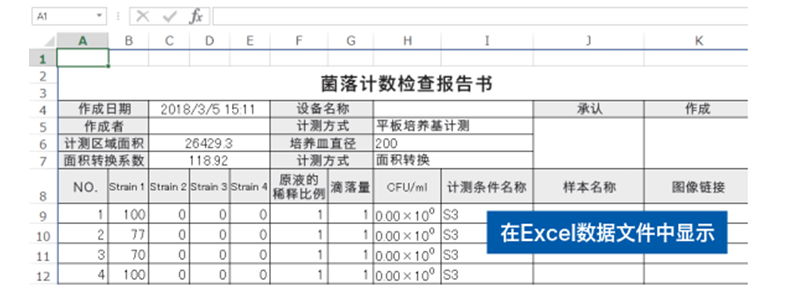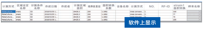 在默認設置下(xià),Petri Dish No,菌落數(shù)量和(hé)測量區(qū)域将顯示在軟件(jiàn)上(shàng)。測量結果可(kě)以轉換為(wèi)Excel工(gōng)作(zuò)表或CSV文(wén)件(jiàn)。