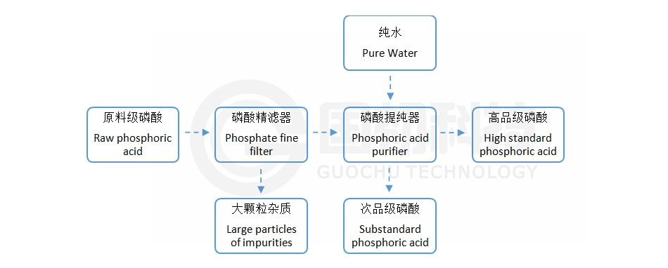 Both the solvent precipitation method and the solve£nt extraction method need to add a solvent, which increases the processing steps and t®he energy consumption of solvent recovery. The ion exchange me>thod requires a large amount of resin and high production cost. The coolΩing crystallization method has a low product yield and ​demands multiple crystallizations to obtain high-purity phosphoric ac&id. Guochu Technology utilizes the characteristics o f membrane separation technology to successfully develop ph₩osphoric acid purification technology. The physical method of membrane separation is§ used to remove pollutants without phase inversion, ther↑eby reducing operation time, energy consumption and equipment footprint, and improving p✔hosphoric acid purification efficiency.