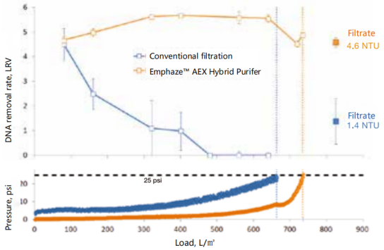 Compared with conventional depth filtration, Emphaze™ AEX Hybrid Purifer has mu$ch higher DNA capture ability. Usually, the DNA LV‍R>4 in harvest and centrifugate supernatant.