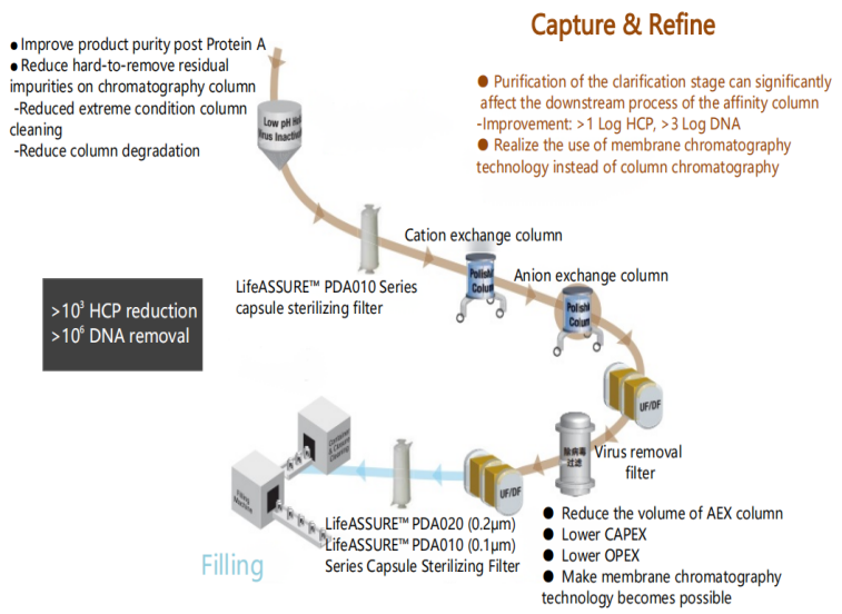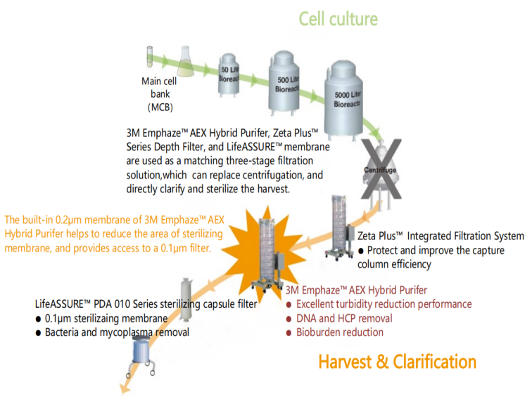Zeta Plus™ Series Depth Filter, Emphaze™ AEX Hybrid Purifer and LifeASSUΩRE™ Membrane as matching filtration solutions can≠ replace centrifugal unit operation and reduce the used area of do♥wnstream sterilizing membrane.