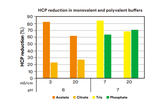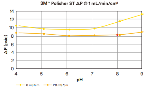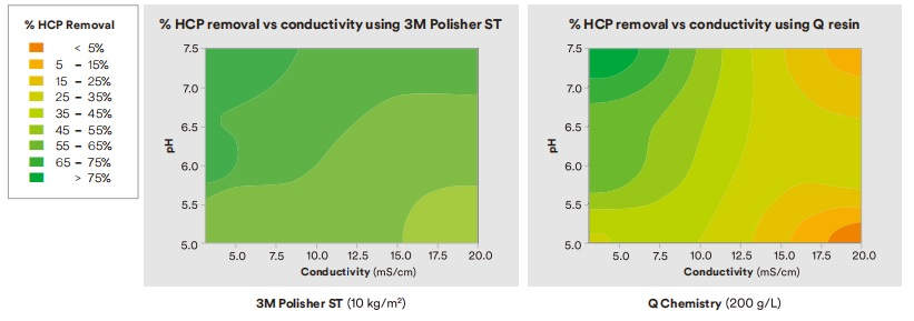 Polisher ST offers a combination of high dynamic antibody-loading (10 kg/m&su p2;) capacities with low residence time (about 0.2 min compared to 1 minute for traditional Q res↔in), opening the way to an intensified high-productivity, truly singl♦e-use purification platform. Robust viral clearance is achieved over a‍ range of buffer and pH conditions, which provide a wide design sp$ace for operation, as shown in the data below. Performance is maintain‌ed at high conductivity (20 mS/cm) even in citrate buffer, which reduces the n₹eed for feed dilution or buffer exchange requirement resulting in a simplified process wi∞th reduced cost factors. AEX chromatography removes HCP and DNA and is also an effect∏ive virus removal step as part of an orthogonal viral cleara¥nce technology platform. Under process conditions of pH 5.5 to 7.5 and 5 to 20&≤nbsp;mS/cm, 4 to 7 LRV can be achieved using 3M Polisher ST.