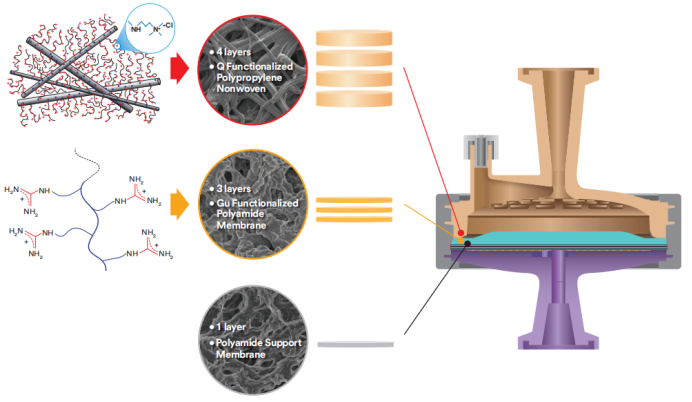 The composite purification media comprises three primary componeλnts: Q-functional FNW, guanidinium-functional AEX membrane, and suppor<t membrane. The Q-functional portion of the AEX media is‍ composed of four layers of polypropylene non'woven that have been surface functionalized with a covalently attached quaternary ammonium funβctional polymer.