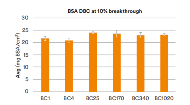 The BSA DBC specification for the functional membrane¥ only is 7.8-12mg BSA/cm² in 25 mM Tris, pH 8, 50mM NaCl. High ↑salt (20 mS/cm) reduces the capacity of the membrane by 2-3 mg/cm². Additiona↔l capacity provided by the FNW at conductivities < ~10 mS/cm.