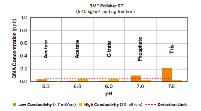 DNA clearance across a variety of initial concentrations (~10-1000 ppb) ×down to detection limit levels (0.05 ppb DNA) in all bu↕ffers (acetate, citrate, phosphate, tris) and conductivities were tested and are r♦eported in the table below.