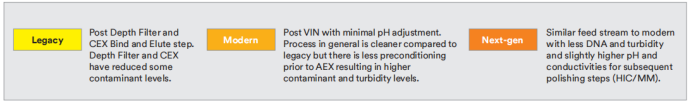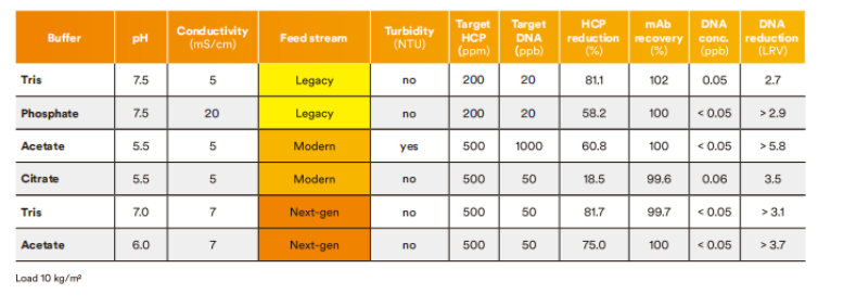 HCP and DNA reduction and mAb recovery in legacy, modern and n•ext gen mAb feed