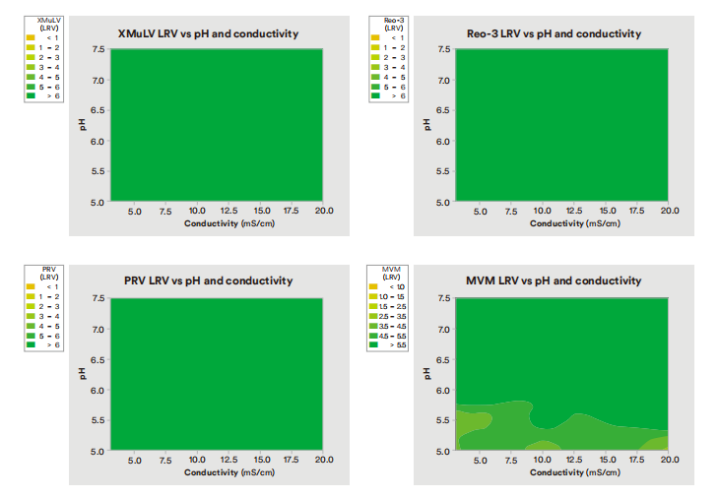 MVM showed > 4 LRV clearance from pH 5.5-7.5, conductivities  5-20 mS/cm and in both monovalent (Acetate/Tris) and polyvalent (Citrate/Phosphate) buffers.'