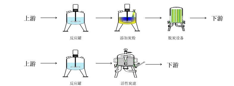 工(gōng)藝步驟 炭粉會(huì)流到(dào)下(xià)遊工(gōng)藝段,需額外(wài)的(de)過濾設備去(qù)除炭顆粒 無炭粒脫落風(fēng)險,吸附過濾合為(wèi)一(yī)個(gè)步驟,減少(shǎo)工(gōng)藝步驟•,提高(gāo)收率