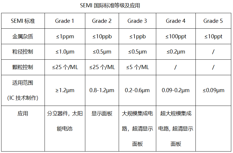 據今日(rì)頭條6月(yuè)20日(rì)訊,超淨高(gāo)純化(huà)學品是(shì)微(wēi)電(©diàn)子(zǐ)技(jì)術(shù)發展過程中不(bù)可(kě)缺少(shǎo)的(de)關鍵基礎化(huà)工(gōng)材料,主要(yào)應用(yòng)在半導體(tǐ)、平∑闆顯示、太陽能(néng)光(guāng)伏領域等及微(wēi)電(diàn)子(zǐ)、光(guāng)電(diàn)子(zǐ)器∑(qì)件(jiàn)制(zhì)造領域。随著(zhe)微(wēi)電(diàn)子(zǐ)技(jì)術(shù)的(de)迅猛發展,對(duì)超淨高(gσāo)純試劑的(de)要(yào)求和(hé)标準也(yě)不(bù)斷在提高(gāo)。超淨高(gāo)純化(huà₹)學品的(de)純度和(hé)潔淨度對(duì)集成電(diàn)路(lù)的(de)成品率、電(diàn)性能(néng)及可(kě)靠性均有(yǒu)十 分(fēn)重要(yào)的(de)影(yǐng)響。不(bù)同線寬的(de)集成電(diàn)路(lù)(IC)制(zhì)作(zuò)工(gōng)>藝技(jì)術(shù),對(duì)超淨高(gāo)純化(huà)學品中金(jīn)屬雜(zá)質、顆粒物(wù)有(yǒu)嚴格要(yào) 求。金(jīn)屬雜(zá)質如(rú)Au、Pt、Fe、Ni、Cu等,以及堿金(jīn)屬Na、K等,©都(dōu)會(huì)對(duì)電(diàn)子(zǐ)元器(qì)件(jiàn)的(de)性能(néng)産生(shēng)嚴重影(yǐng)響。∏因此,在制(zhì)備超淨高(gāo)純化(huà)學品時(shí),除金(jīn)屬雜(zá)質和(hé)顆粒是(shì)至關重要(yào)的(de)環節,如(rú)下(xià)表所示: